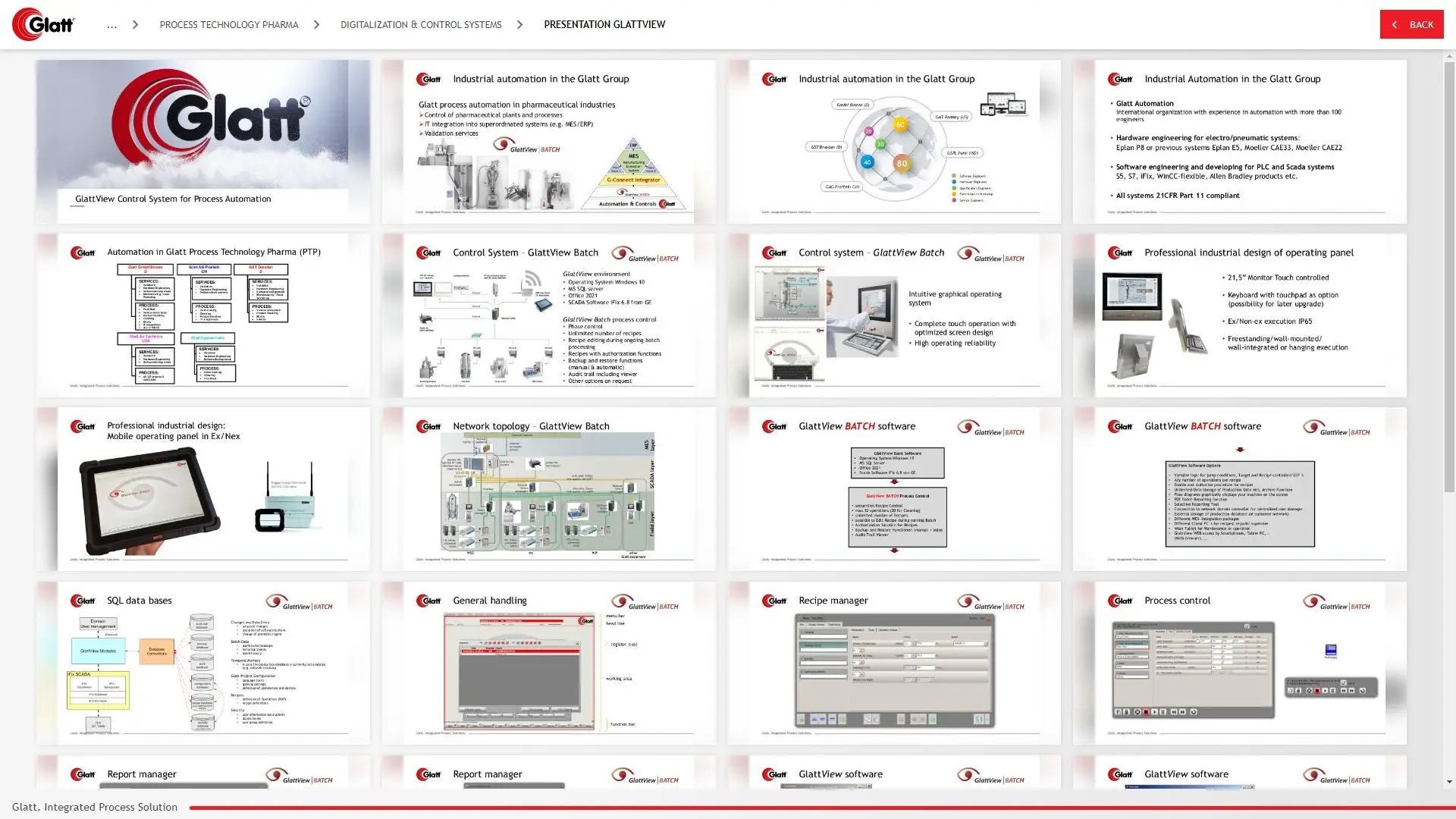 Die Glatt Group präsentiert auf Messen und im direkten Kundengespräch ein breites Spektrum an Anlagen und Prozessen — von Wirbelschichttechnik über Granulierung bis zu Beschichtungsverfahren für Pharma und Food Processing. Die Vertriebsteams brauchten ein Tool, mit dem sie schnell und zielgerichtet auf Detailinformationen zugreifen können: je nach Gesprächssituation die passende Präsentation, das richtige Datenblatt oder das erklärende Video — ohne langes Suchen, auch ohne stabile Internetverbindung.