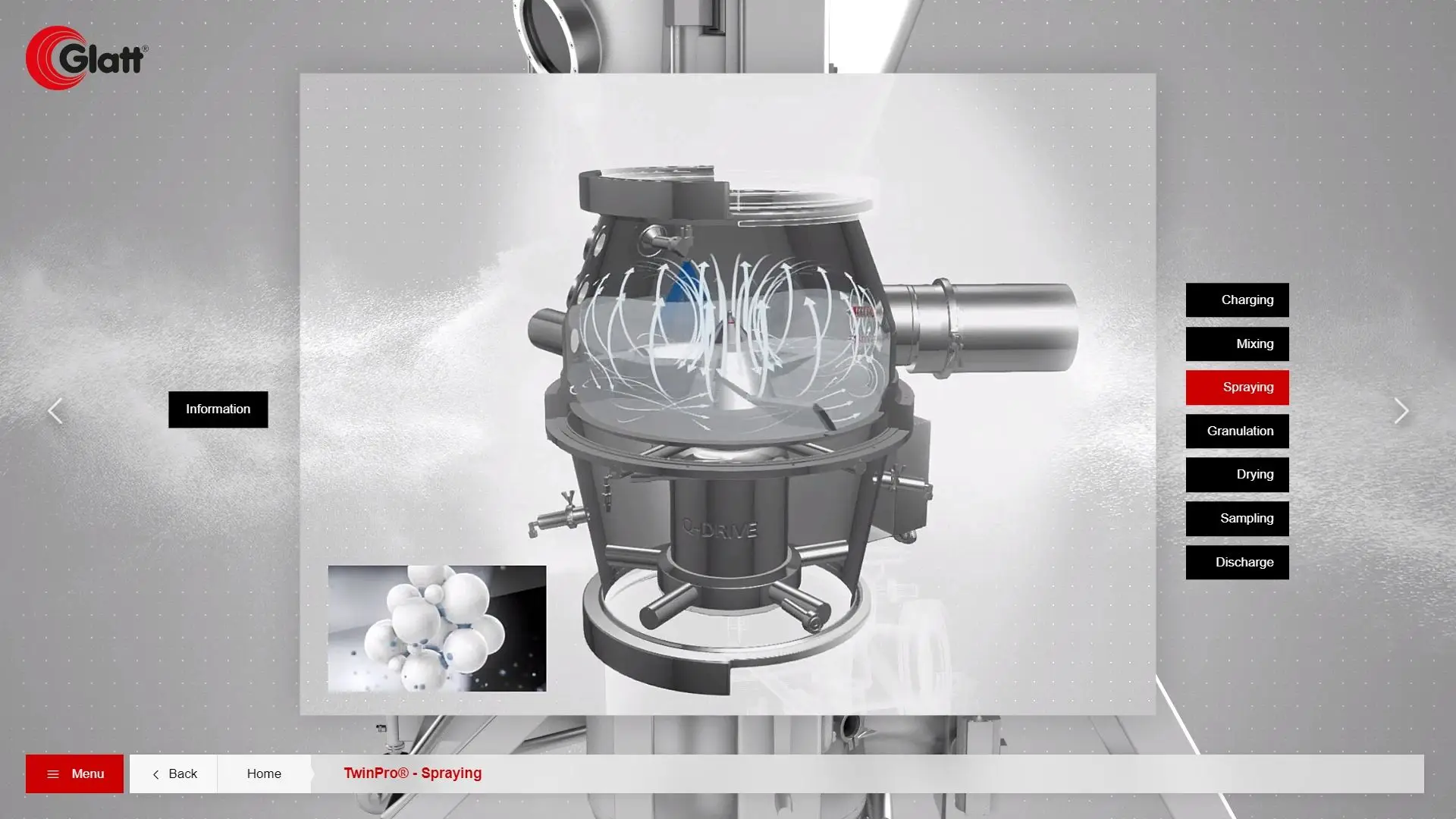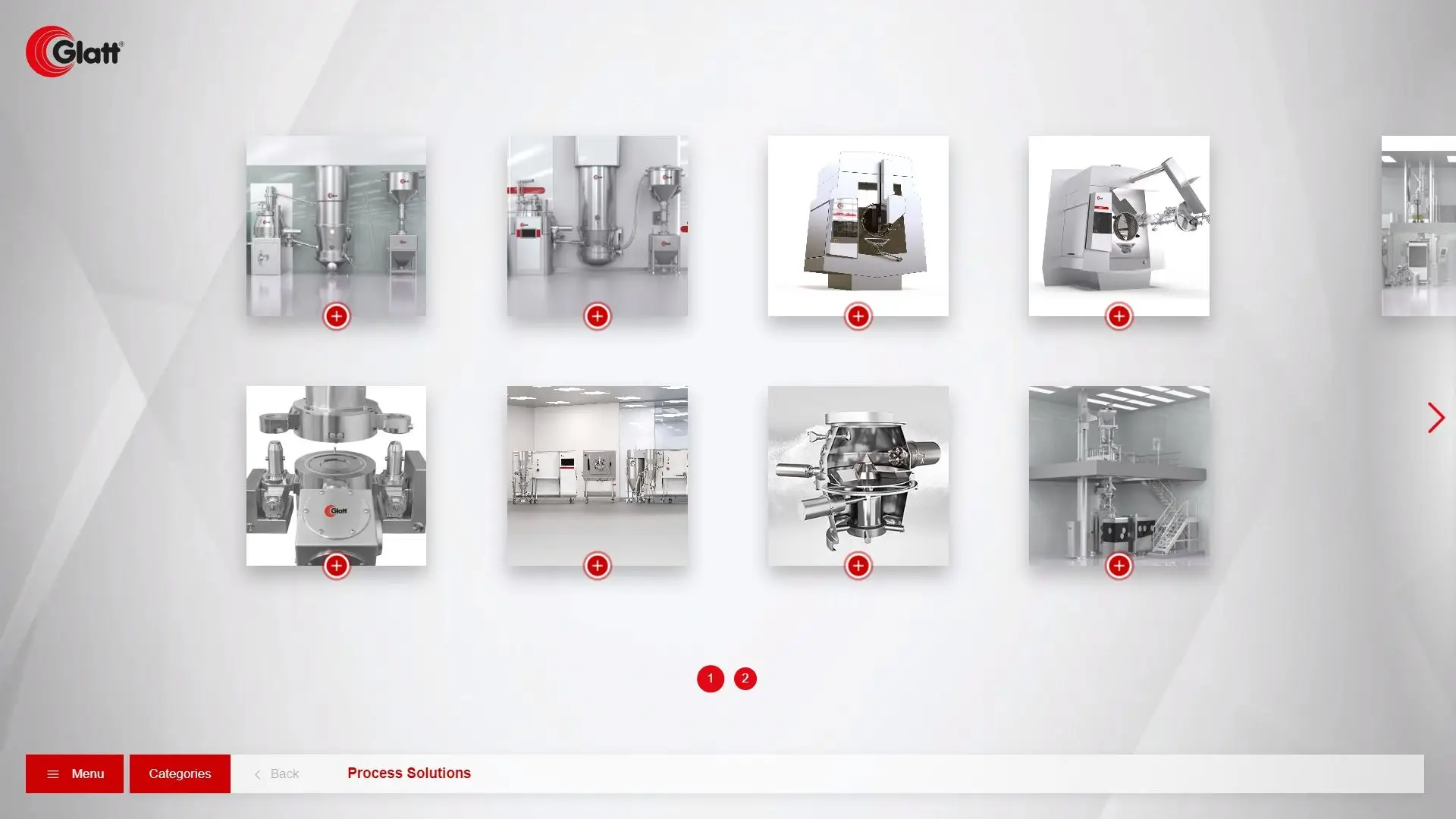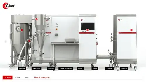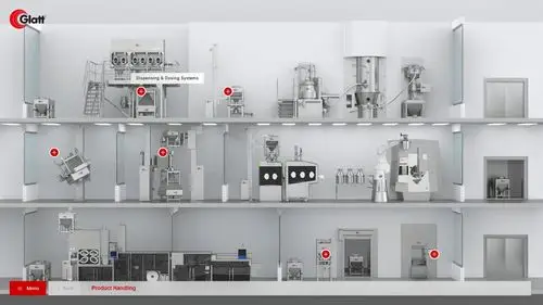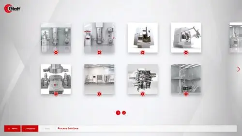 Für GLATT haben wir eine interaktive Sales-Anwendung auf Basis der BOX entwickelt, die alle 12 Maschinen als 3D-Visualisierung zugänglich macht. Der Zugriff erfolgt über Login — je nach Weltregion und Marktsegment des Nutzers werden unterschiedliche Maschinen, Varianten und Anwendungsbeispiele ausgespielt.