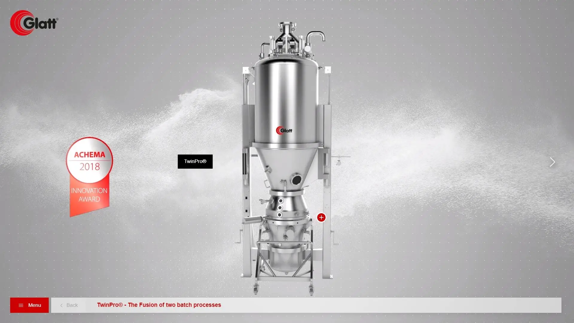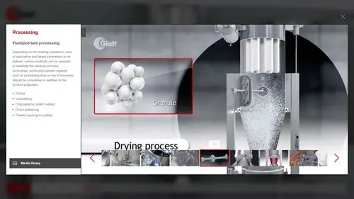 12 Maschinen der Glatt Process Solutions lassen sich auf Messen nur eingeschränkt physisch präsentieren — zu viele Exponate, zu komplexe Prozesse, zu unterschiedliche Zielgruppen. Hinzu kommt die globale Ausrichtung: Je nach Weltregion und Marktsegment sind andere Schwerpunkte relevant. Gesucht war eine Lösung, die das gesamte Spektrum digital zeigt — als digitaler Messestand, der Inhalte abhängig von Region und Markt ausspielt.